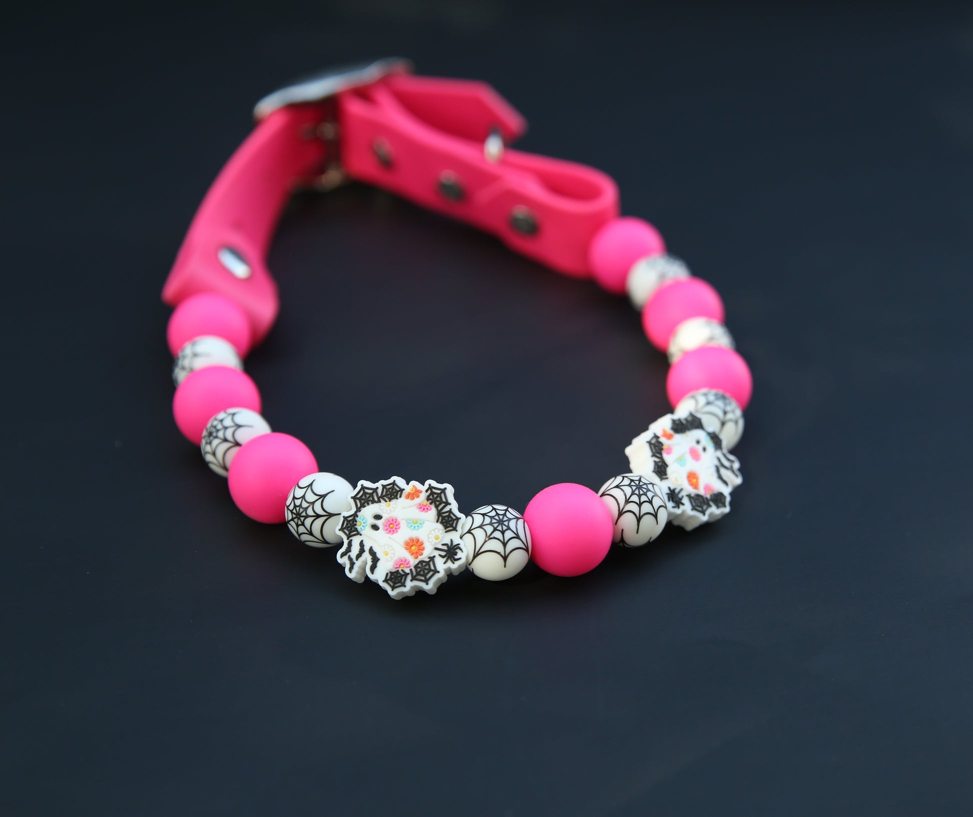 This Specific design is offered in 1 inch or 1/2inch biothane straps + silicone beads, O-Ring or Martingale Designs. O-Ring and Martingale Designs are custom to your pets neck. Bead sizes will vary based on sizing and design.