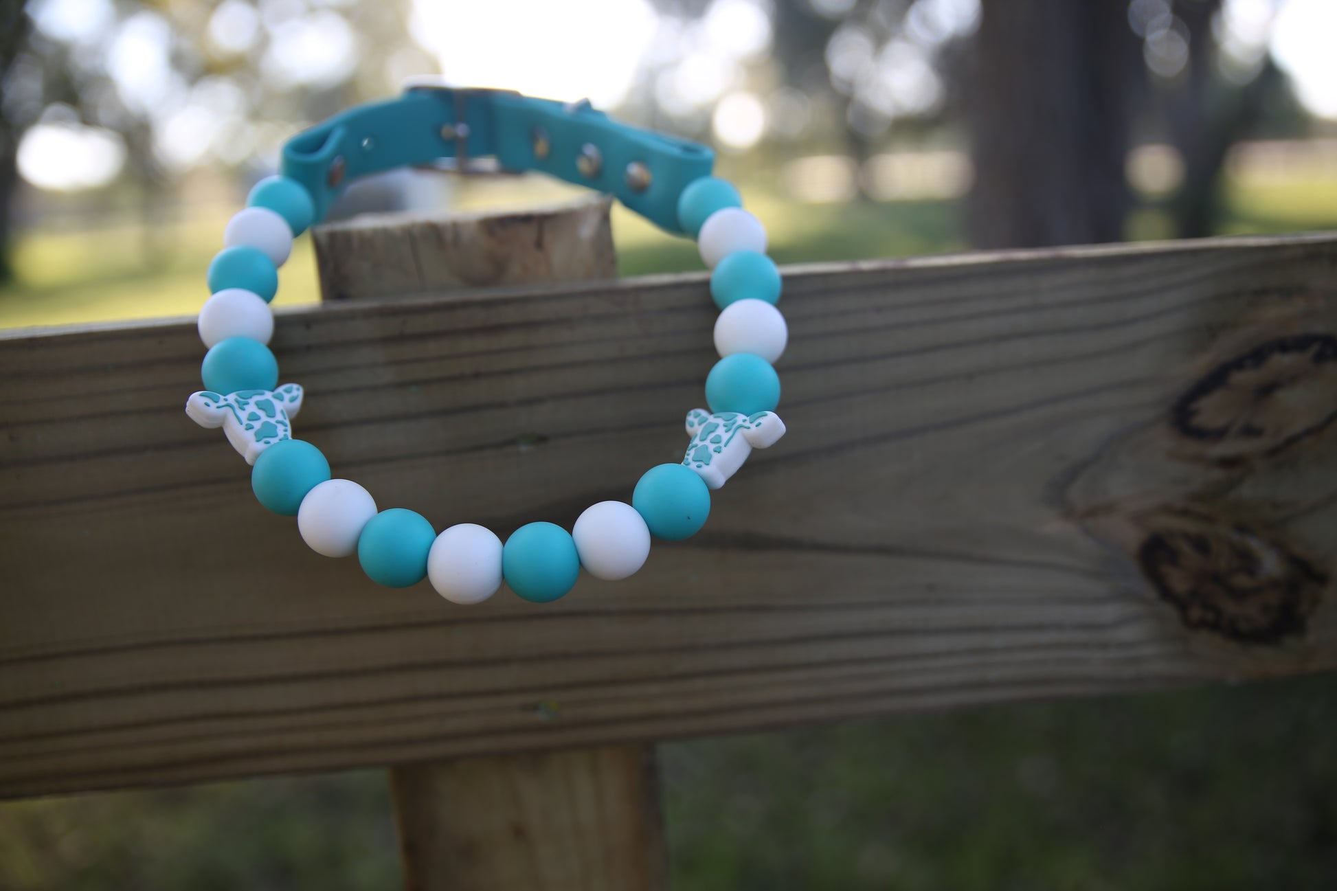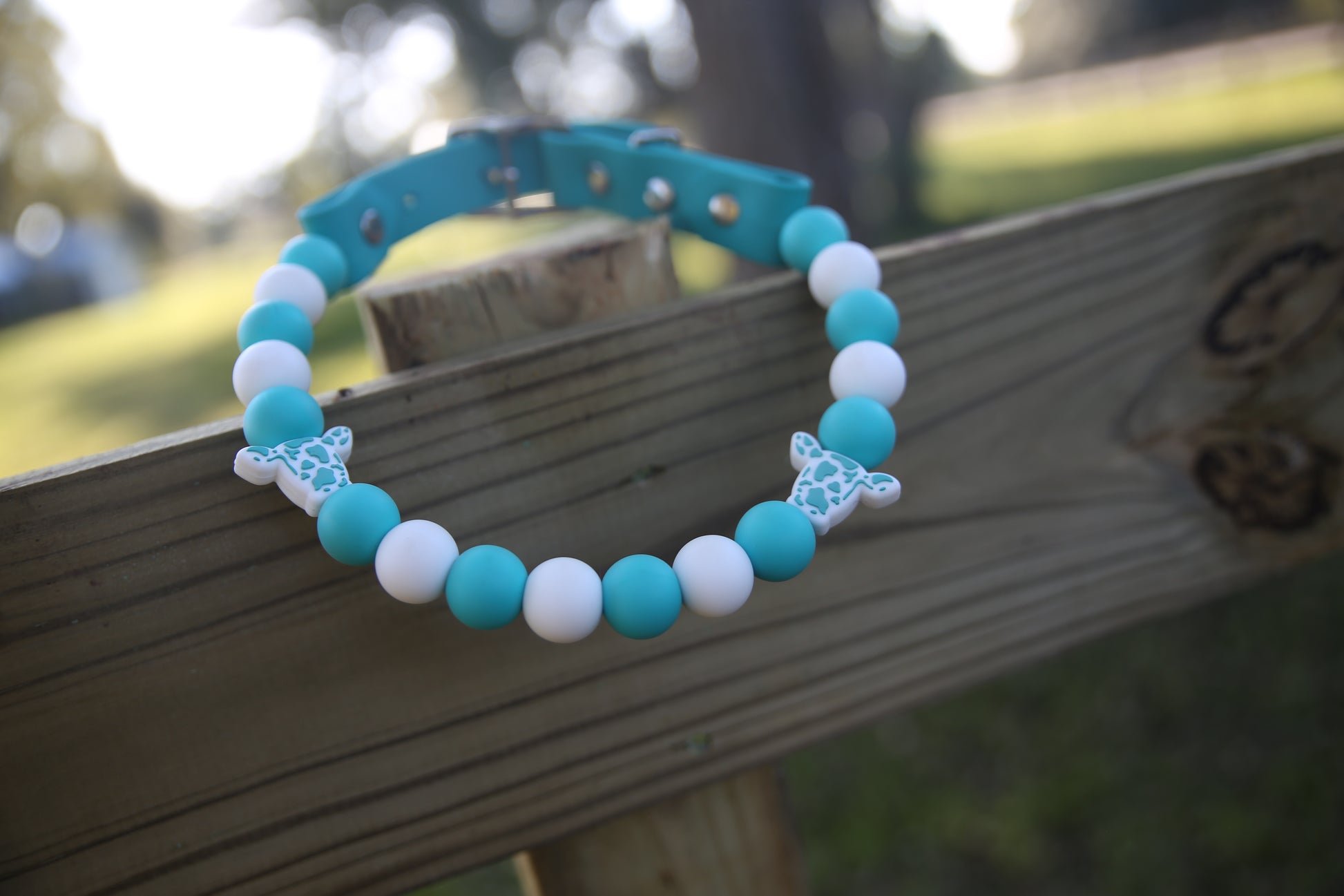 This Specific design is offered in 1 inch or 1/2inch biothane straps + silicone beads, O-Ring or Martingale Designs. O-Ring and Martingale Designs are custom to your pets neck. Bead sizes will vary based on sizing and design.