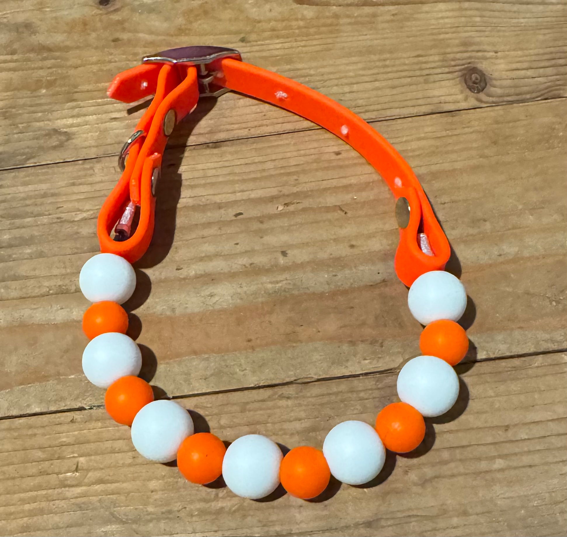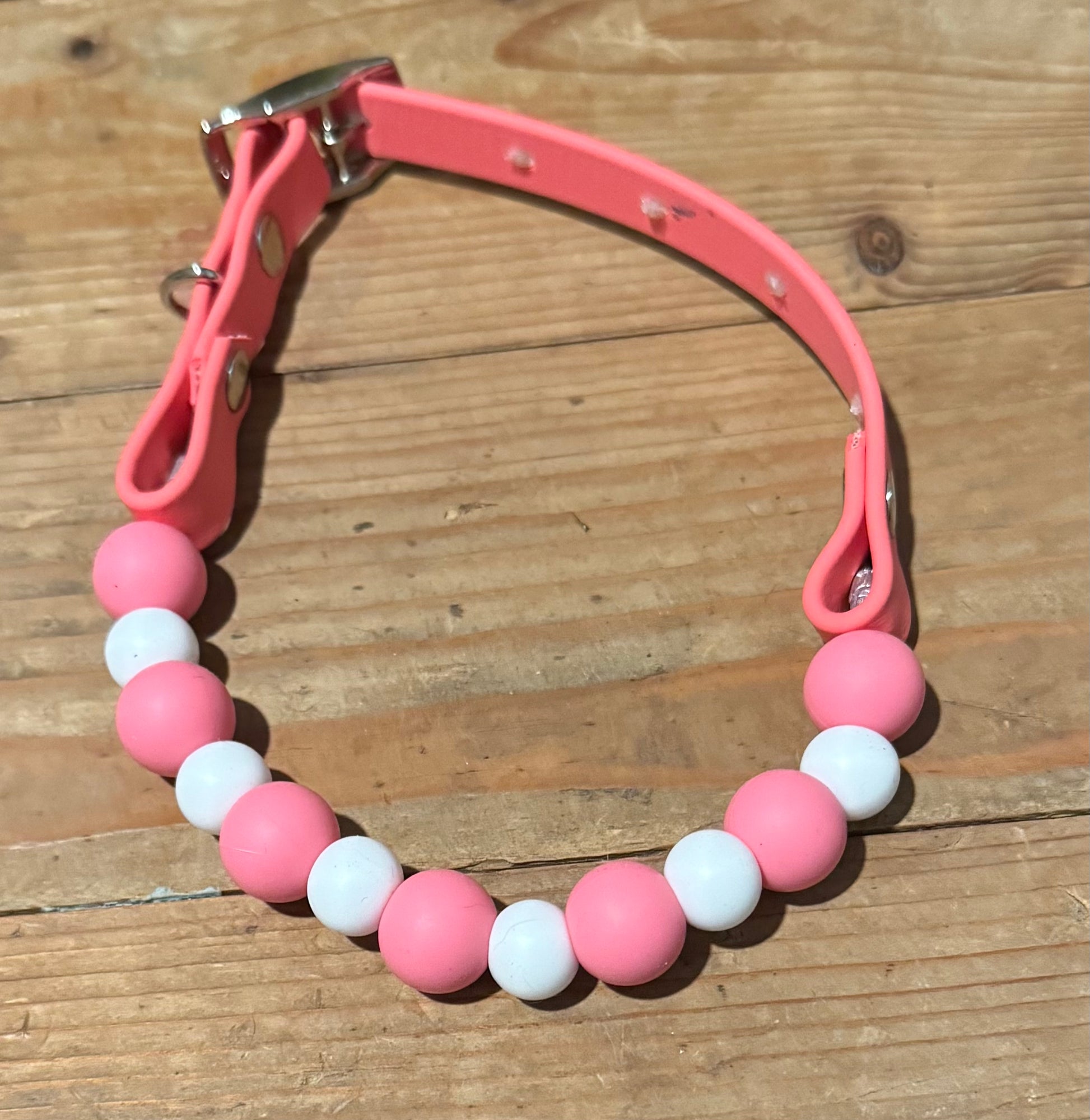 This Specific design is offered in 1 inch or 1/2inch biothane straps + silicone beads. Bead sizes will vary based on sizing and design.