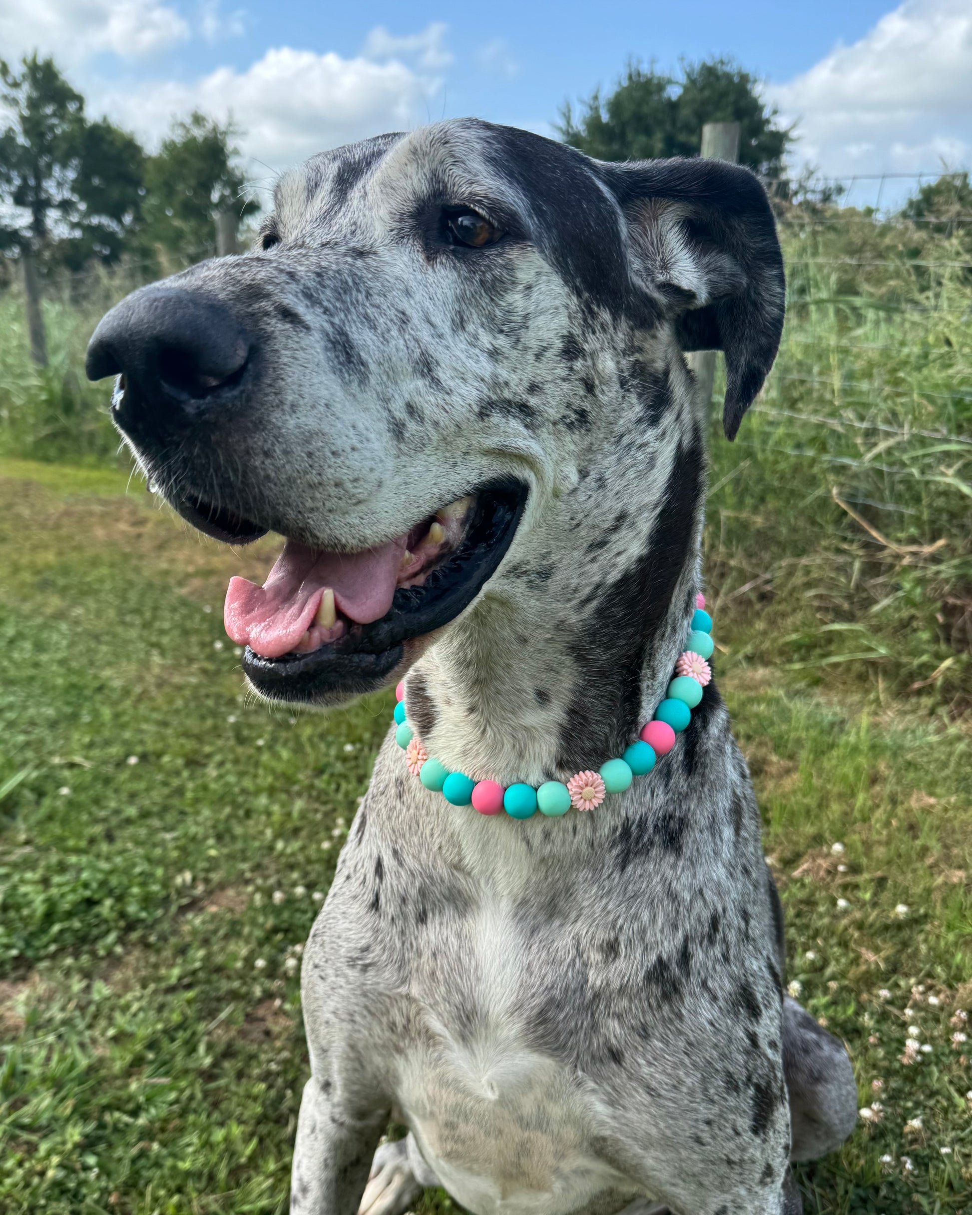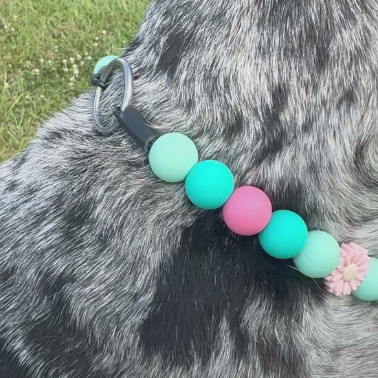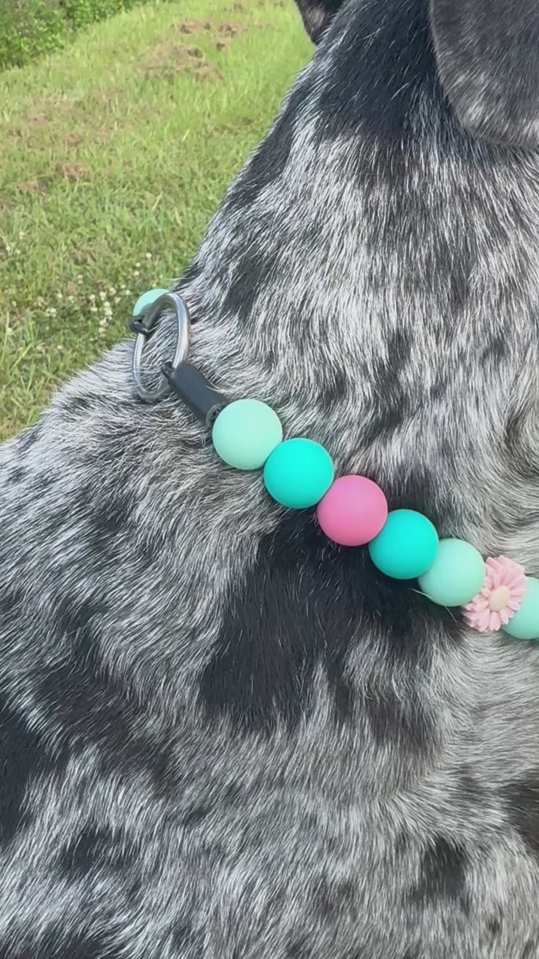 This Specific design is offered in 1 inch or 1/2inch biothane straps + silicone beads, O-Ring or Martingale Designs. O-Ring and Martingale Designs are custom to your pets neck. Bead sizes will vary based on sizing and design.
