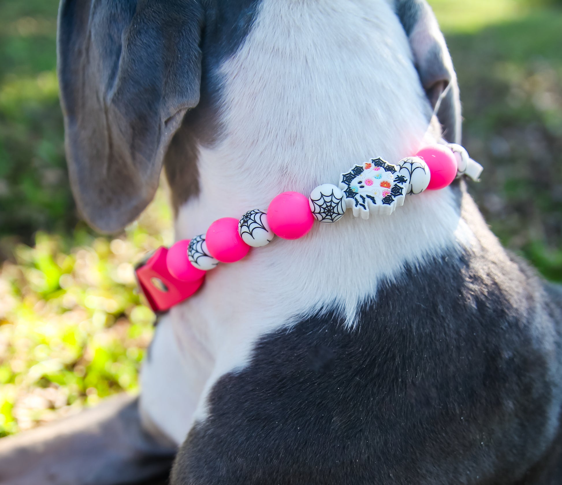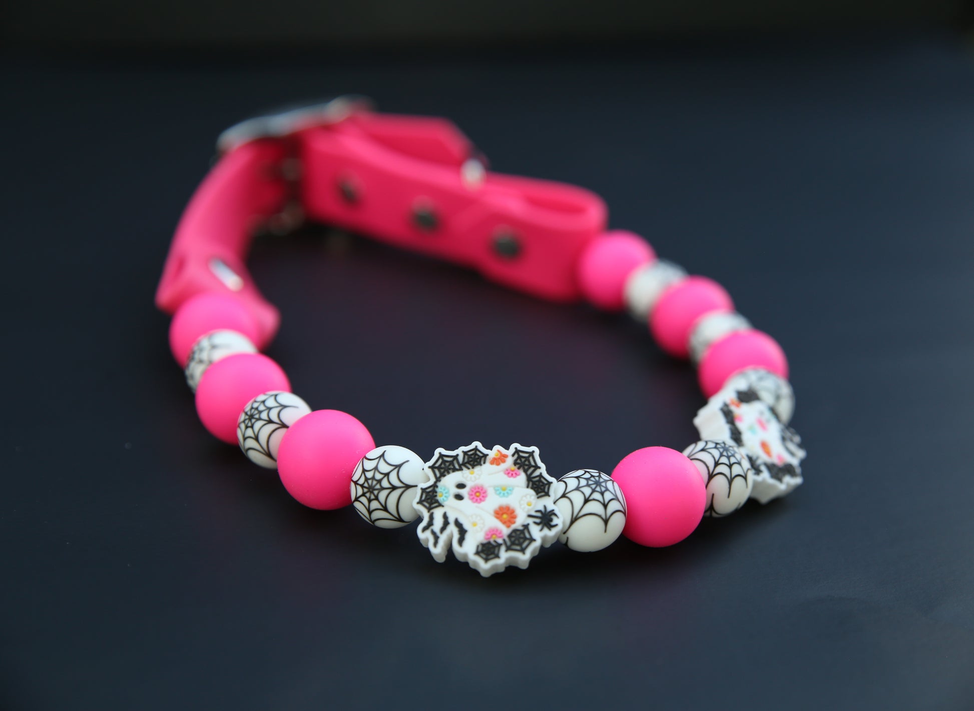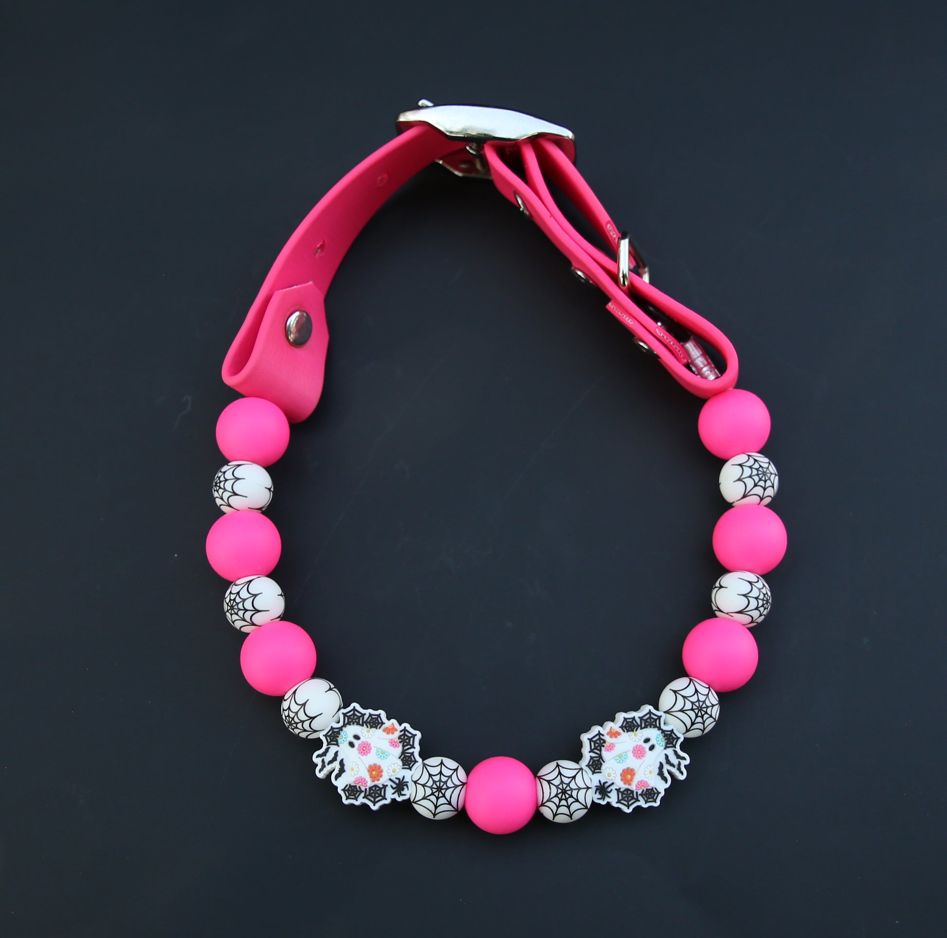 This Specific design is offered in 1 inch or 1/2inch biothane straps + silicone beads, O-Ring or Martingale Designs. O-Ring and Martingale Designs are custom to your pets neck. Bead sizes will vary based on sizing and design.