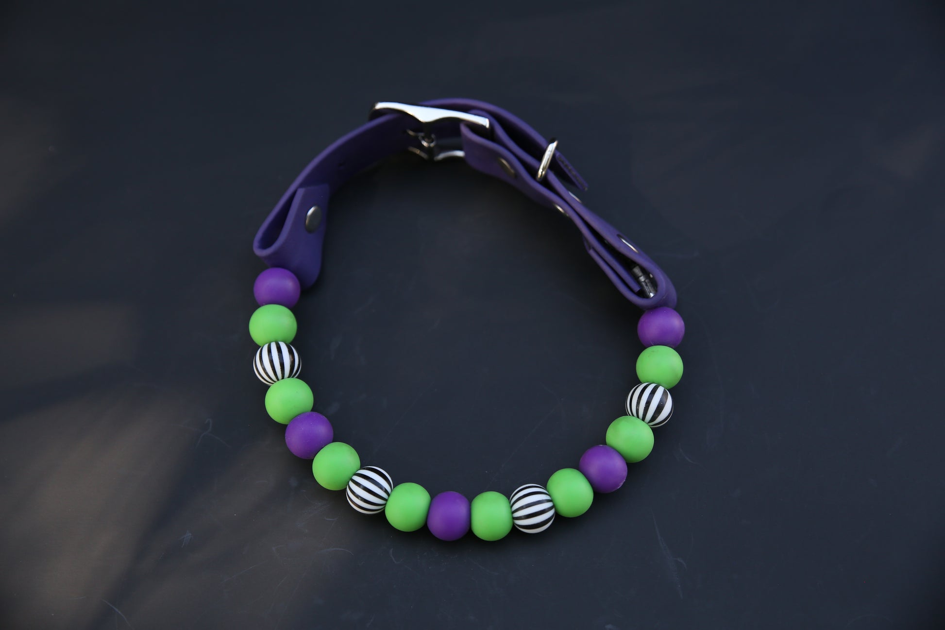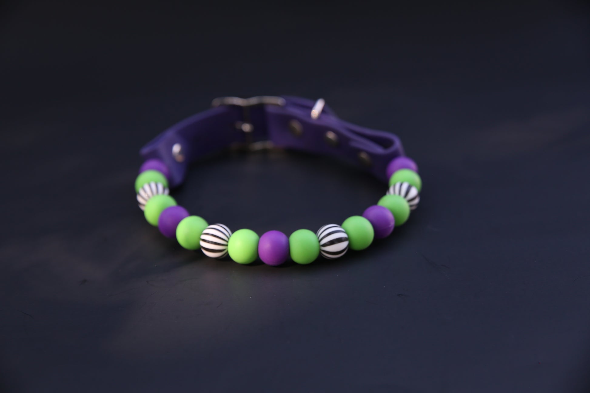 This Specific design is offered in 1 inch or 1/2inch biothane straps + silicone beads, O-Ring or Martingale Designs. O-Ring and Martingale Designs are custom to your pets neck. Bead sizes will vary based on sizing and design.